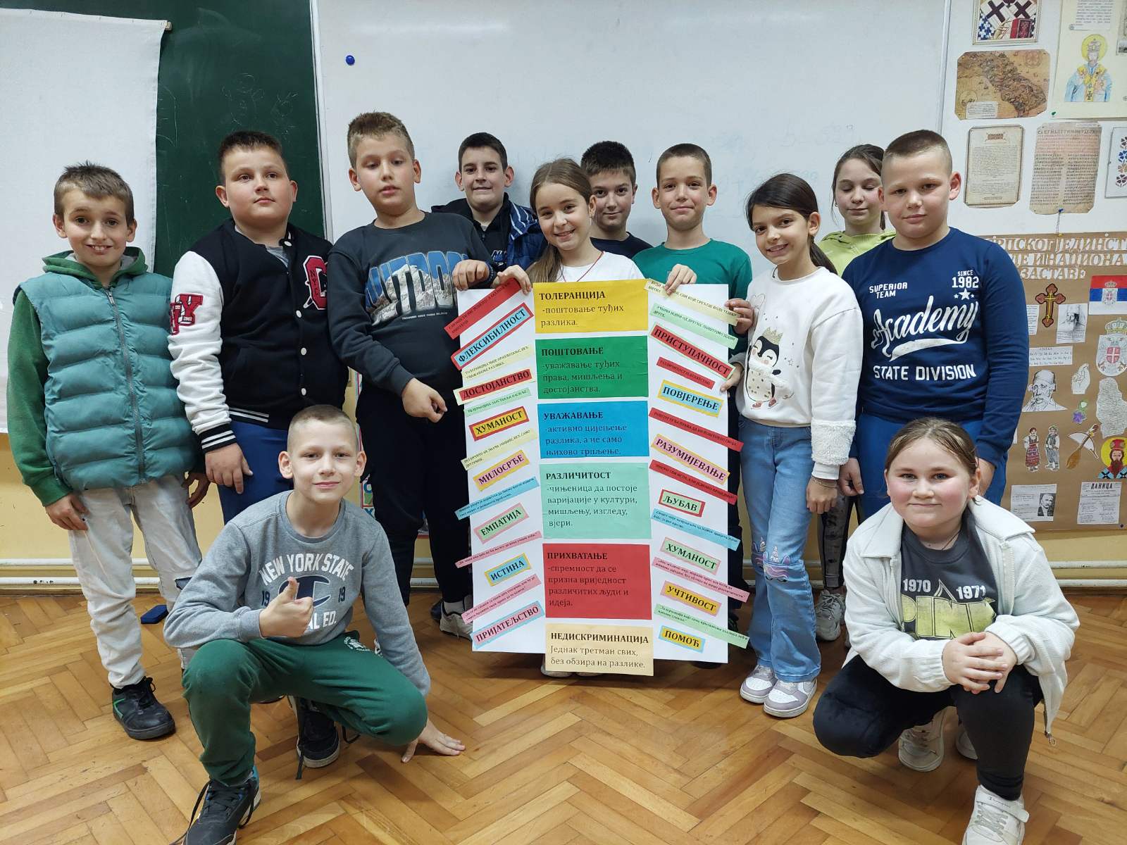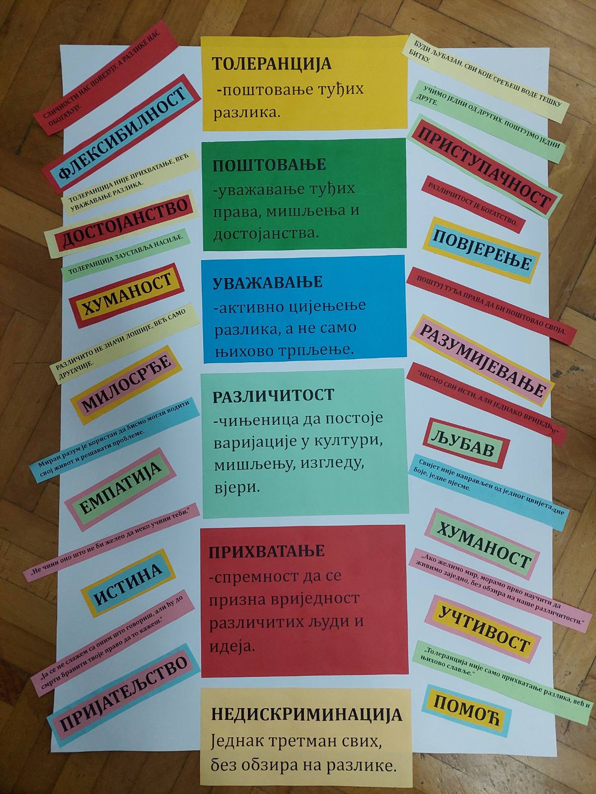 Међународни дан толеранције обиљежава се 16. новембра. Ученици IV6 су на часу одјељењске заједнице разговарали са учитељицом Маријом Шкрбић о важности толеранције, поштовању и уважавању разлика и различитих мишљења. Овом приликом су израдили пано који ће украшавати зидове њихове учионице и подсјећати на људске особине које човјек треба његовати.