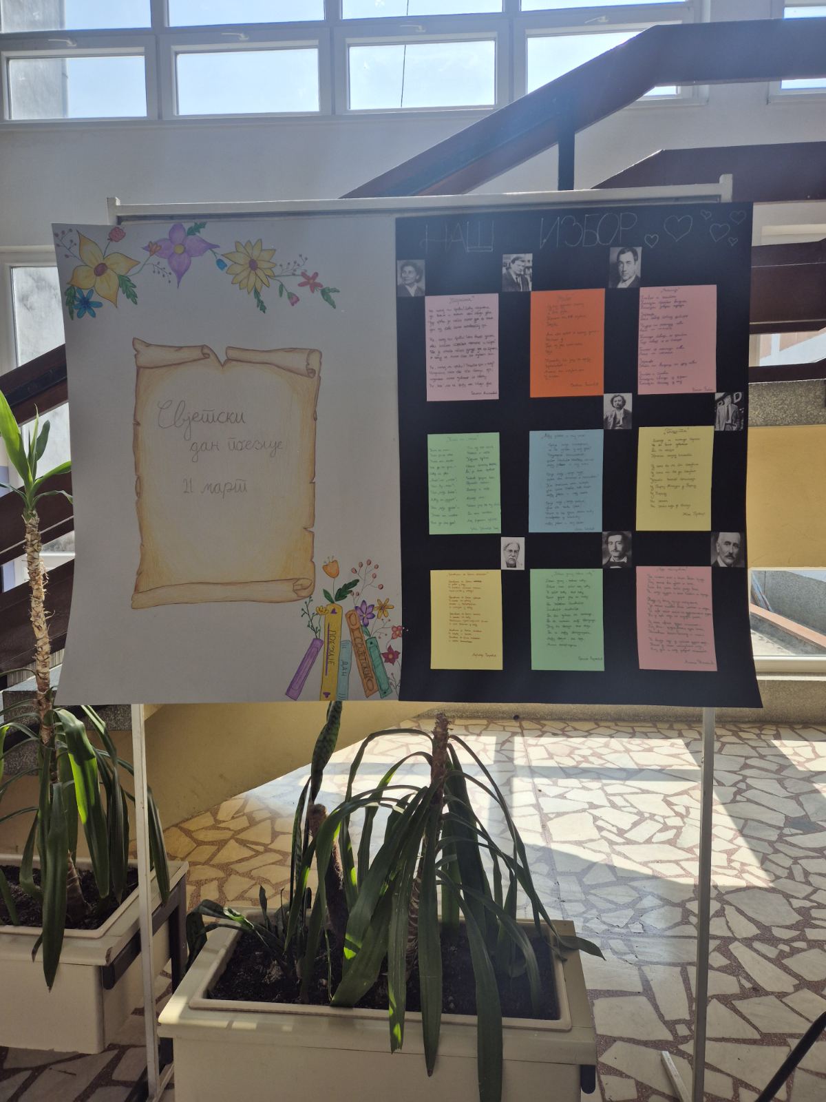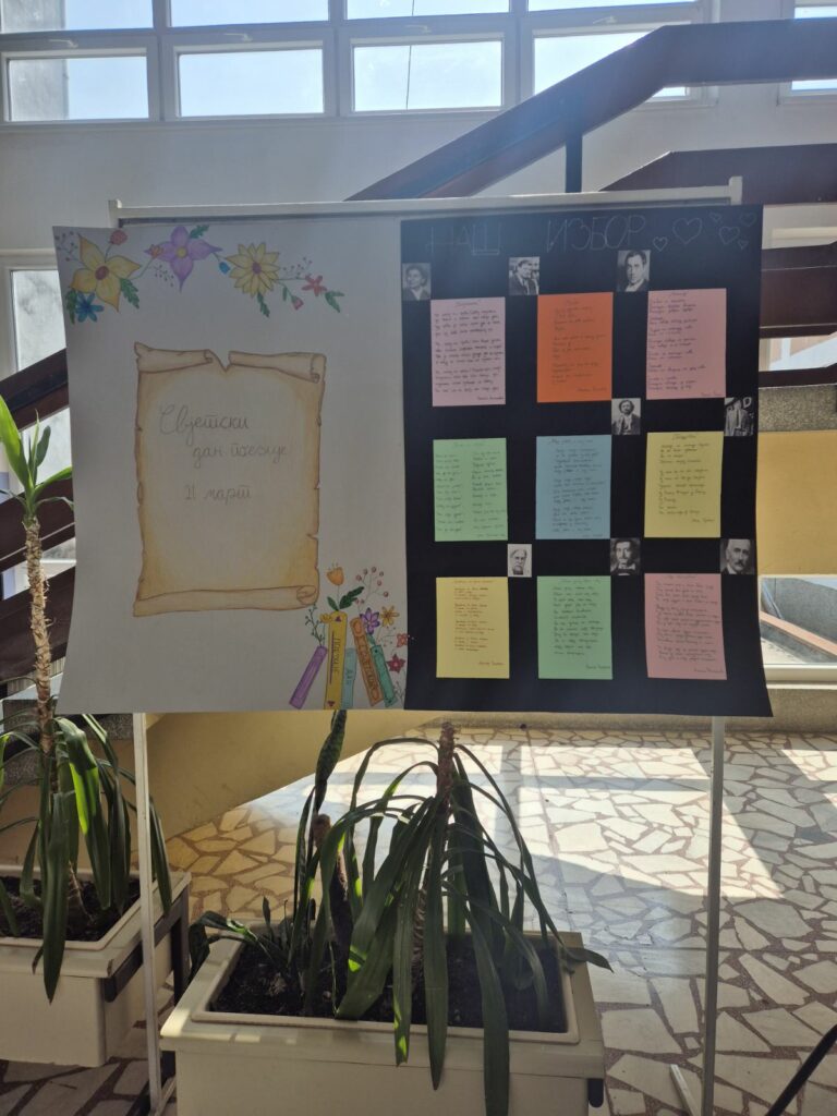 Свјетски дан поезије обиљежава се 21. марта. Ученици VI1 и VIII6 разреда су овом приликом на литерарној секцији са наставницом српског језика Тијаном Новаковић разговарали о поезији, значају читања и писања као и објављивања поезије. Одабрали су по њиховом избору најљепше стихове и изложили их у холу школе.